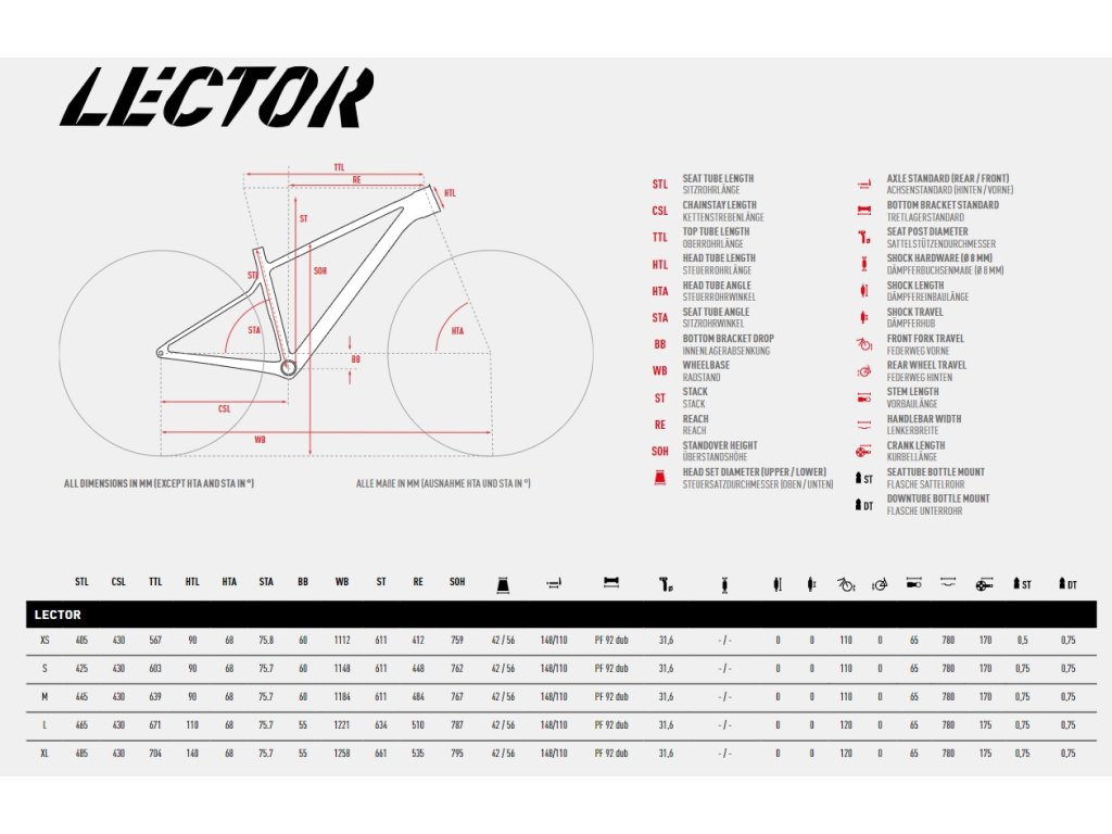 Nový Lector má dlhší reach, kolmejší uhol sedlovej trubky (75.7 °) a sedlovku bez off-setu. Reach je teraz impozantných 510 milimetrov vo veľkosti L. To v kombinácii s uhlom hlavovky 68° a dĺžkou reťazových vzpier 430 milimetrov vedie k rázvoru kolies 1221 milimetrov.