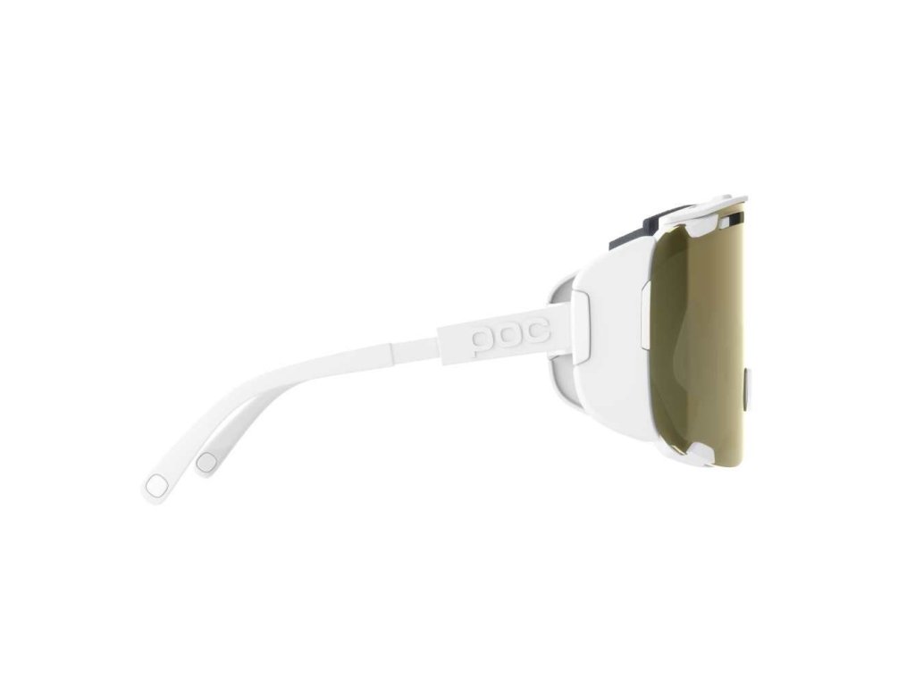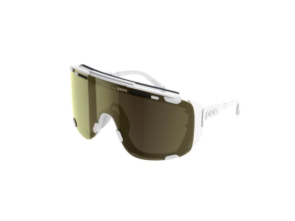 Okuliare POC Devour Glacial v bielej farbe so zlatými sklami sú ultimátnym nástrojom pre dobrodruhov. Ponúkajú ochranu, ktorú nezvládnu bežné športové okuliare, pričom si zachovávajú excelentnú ventiláciu, ktorá zabraňuje zahmlievaniu aj pri intenzívnom stúpaní. Štíty Glacial sú ľahko odnímateľné, takže ich môžete v sekunde premeniť na štýlové okuliare pre jazdu v meste alebo na bežných trailoch. S priloženým **náhradným čírym sklom** získavate produkt, ktorý vás ochráni 365 dní v roku, od ostrého letného slnka na vrchole hory až po zamračené dni v hlbokom lese.