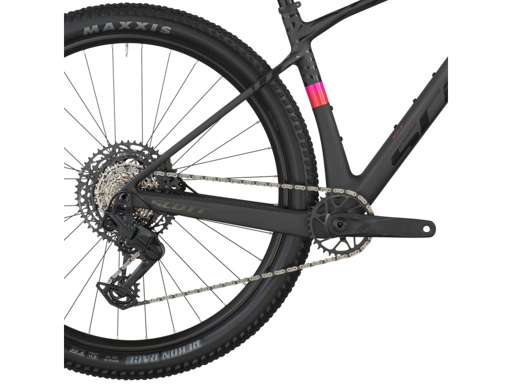 Nový Scale RC využíva monocoque konštrukciu, vďaka ktorej je celý predný trojuholník rámu vyrobený z jedného formovacieho celku. Rám pozostáva len z troch samostatných karbónových dielov, čo výrazne znižuje počet spojov, minimalizuje hmotnosť a zároveň zvyšuje tuhosť – presne to, čo sa očakáva od moderného pretekárskeho hardtailu.